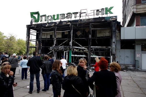 После этого бандиты перешли уже к простому уничтожению отделений крупнейшего банка страны. Здания Привата были разгромлены в Донецке, Горловке, Мариуполе, Енакиево, Краматорске и других городах Донецкой и Луганской областей.