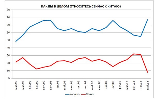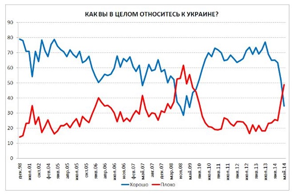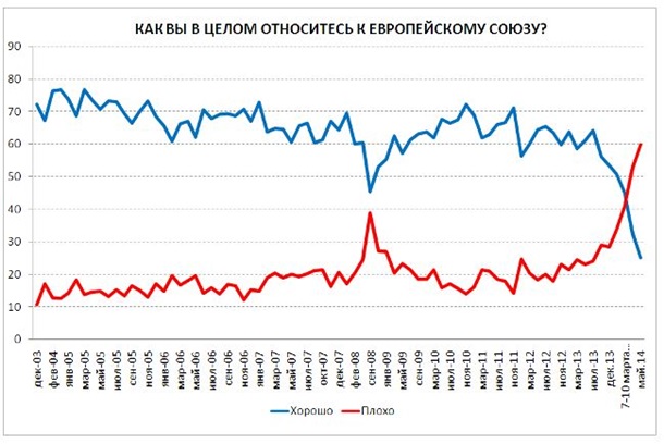 Опрос проводился 23-26 мая 2014 года по репрезентативной всероссийской выборке городского и сельского населения среди 1600 человек в возрасте 18 лет и старше в 130 населенных пунктах 45 регионов страны. Распределение ответов приводится в процентах от общего числа опрошенных вместе с данными предыдущих опросов. Статистическая погрешность данных этих исследований не превышает 3,4%.