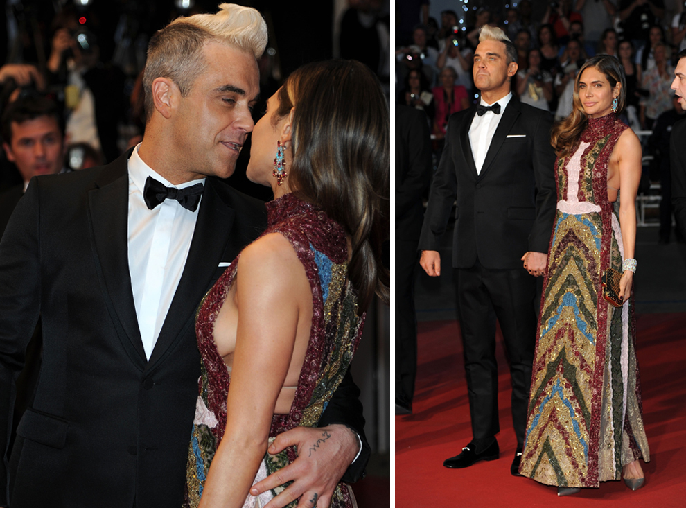 Платье супруги известного певца Робби Уильямcа, на первый взгляд, отличалось редкой целомудренностью. Но стоило Айде повернуться боком — как стало понятно, почему Робби даже на красной дорожке не может стоять спокойно рядом со своей красавицей женой.
