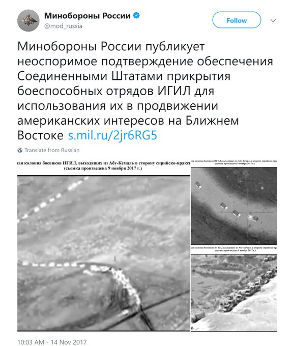 «На фотоснимках, сделанных 9 ноября 2017 года российскими беспилотными аппаратами, зафиксировано, как вооруженные формирования ИГИЛ, спасаясь от ударов российской авиации и правительственных войск, многокилометровыми колоннами уходят из Абу-Кемаля в направлении перехода Вади-эс-Сабха на сирийско-иракской границе», — говорилось в сообщении Минобороны.