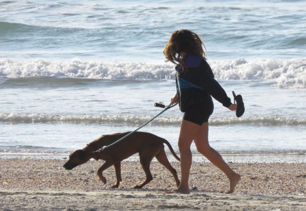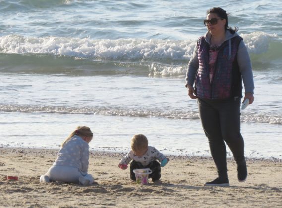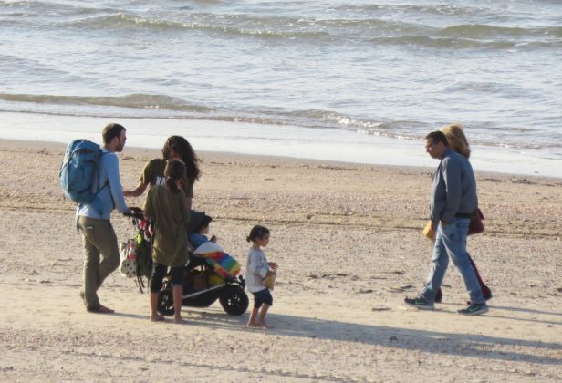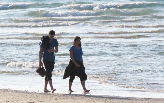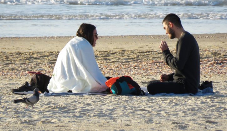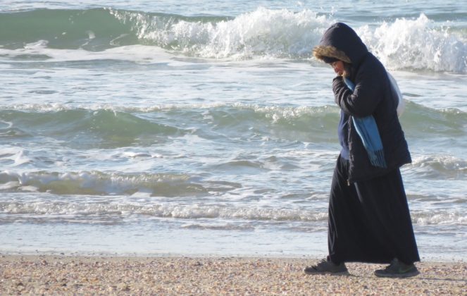 А контрастом двум туристкам с севера (туристкам — ибо какой израильтянин полезет в море в январе?) стала дама, укутанная в нечто вроде полушубка, да еще и с капюшоном. Жаль только, в один кадр с купальщицами не попали — оказались на разных пляжах.