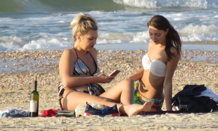 Но когда мы увидели двух очаровательных купальщиц с початой бутылкой вина, стало ясно: кадр дня сделан! А рядом с девушками в бикини резвились полуобнаженные аполлоны с ракетками, поодаль устраивали заплыв серфингисты, а совсем далеко белел парус — и отнюдь не одинокий.
