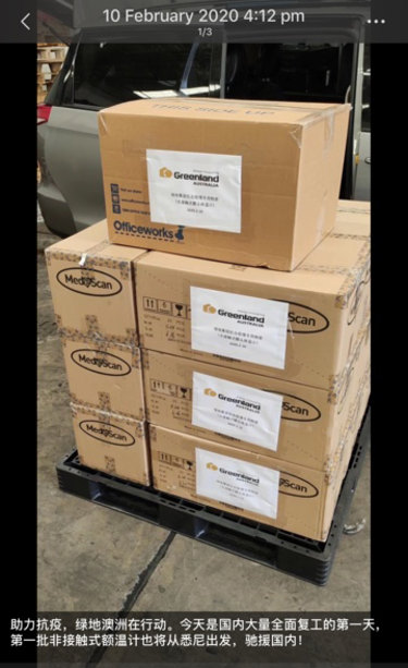 Стало известно, что Шервуд Луо, главный управляющий австралийского филиала Greenland, даже хвастался этим в социальных сетях. Например, его февральский пост в WeChat: «Так действует Greenland Australia. Вторая партия бесконтактных лобных термометров готова к отправке в Китай!»