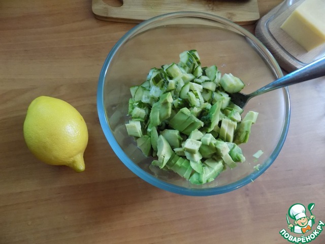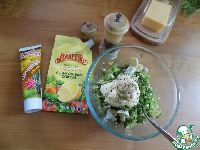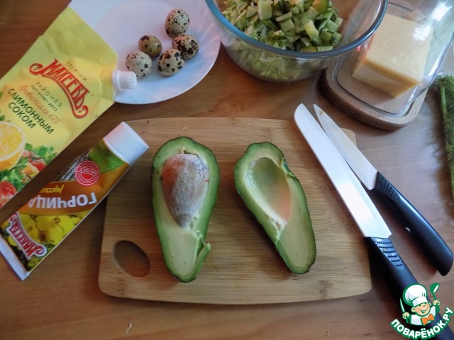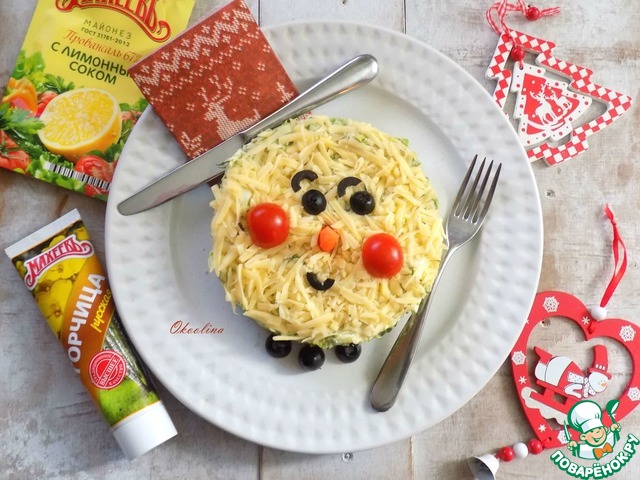 Для оформления снеговика Время приготовления: Количество порций: 4 Рецепт «Салат "Снеговик" с авокадо»:Куриное мясо и яйца нужно сварить. В салат нужно резать всё мелко, даже пекинскую капусту, чтобы снеговик у нас не был лохматым. Берём салатник и выкладываем в него порезанное мясо курицы и пекинскую капусту. Авокадо режу всегда керамическим ножом, от него оно дольше не темнеет (не окисляется). Выкладываем авокадо в салатник и огурец с укропом мелко порезанным. Отрезаем от лимона четвертушку и отжимаем сок прямо в салатник на авокадо. Перемешиваем. Режем яйца перепелиные или куриные, отправляем в салатник. Заправила салат по своему вкусу майонезом и горчицей. Поперчила и немного посолила. Если салат будут есть дети, то горчицу и перец класть не нужно. Тщательно перемешиваем. Если будите делать салат без формирования мордочки снеговика, то сыр следует натереть и добавить в салатник. Я сыр оставила на верхний слой салата. Я буду формировать мордочку снеговика и для этого взяла форму разъёмную для выпечки, соответствующую по диаметру блюду, в котором буду подавать салат. В идеале конечно кольцо, но у меня только маленького диаметра есть. Выкладываем салат в форму, уплотняем. Я использовала силиконовую лопаточку. Натираем сыр... ... и выкладываем его верхним слоем. Снимаем форму или кольцо. Делаем мордочку снеговику. Я использовала морковь-нос, щёчки красные-помидорка-черри пополам, глаза, бровки и ротик-колечки маслин. Цилиндр-это у меня салфетка сложенная и нож, а вилка-метла. Вот такой весёлый парень!