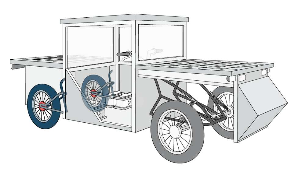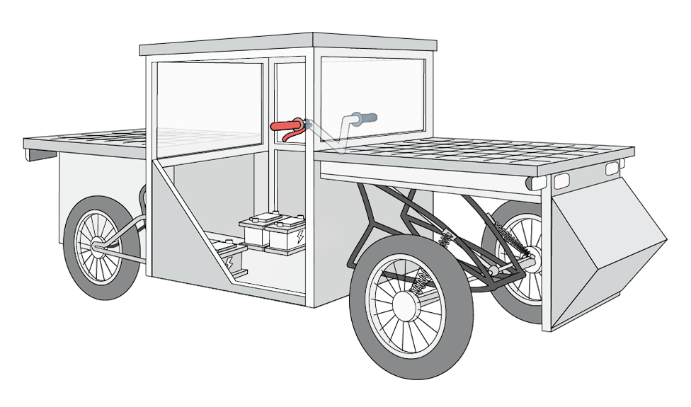 Чтобы увеличить максимальную скорость, пришлось полностью пересмотреть схему. Теперь у “Емели” четыре электромотора, и каждый работает на одно колесо. Это позволяет разгоняться до 55 километров в час. Не так уж и много для шоссе, но по деревенским дорогам – более чем достаточно.