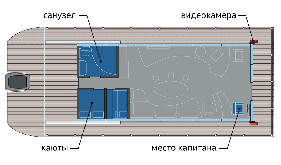 Однако рулить таким домом на воде непросто. Штурвал (обычный руль) находится в передней части лодки в салоне, и из-за больших размеров судна обзор возможен только при помощи видеокамер.
