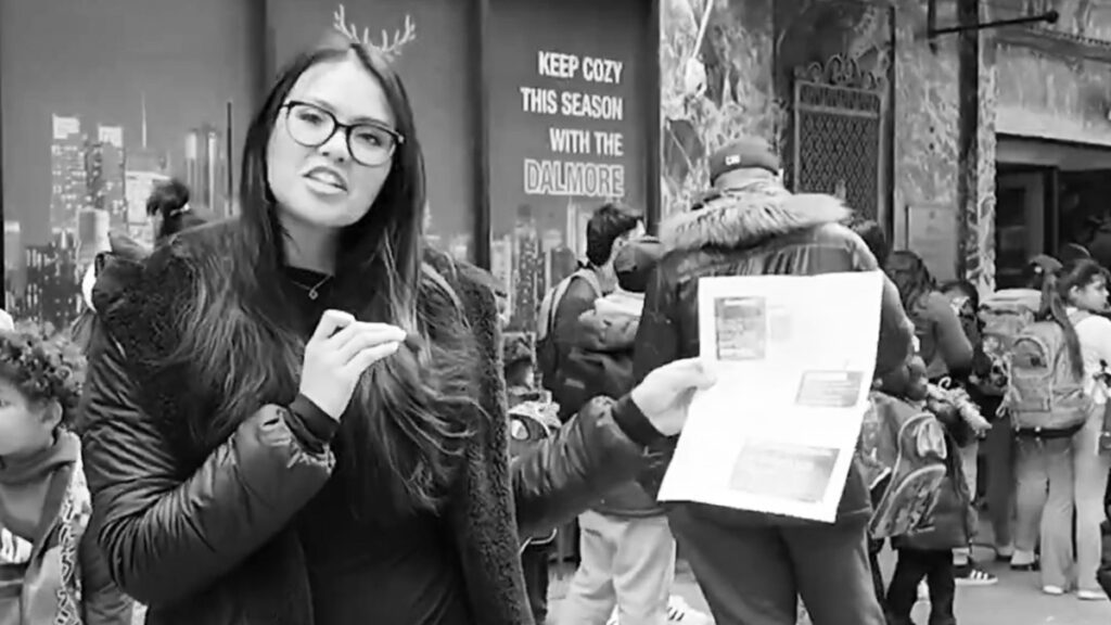 Автор Turning Point USA Савана Эрнандес вела репортаж возле отеля Roosevelt в Нью-Йорке, когда обнаружила стол Jackson Hewitt, на котором раздавались листовки нелегальным иммигрантам.