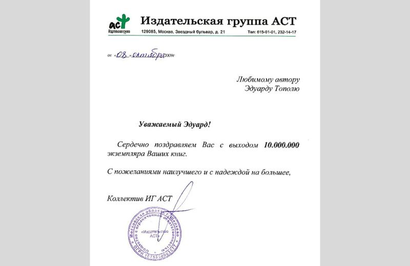 В то же время, не могу удержать сочувствия путинским фашистам. В 2009 году, на свой день рождения, я получил от издательства АСТ вот такое поздравление: