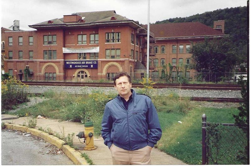 Sic transit gloria mundi – так проходит земная слава. Автор – на фоне полупустых помещений WABCO, часть подразделений которого переехала из Wilmerding (пригород Питтсбурга) на юг в конце 1980-х годов. (1990.)