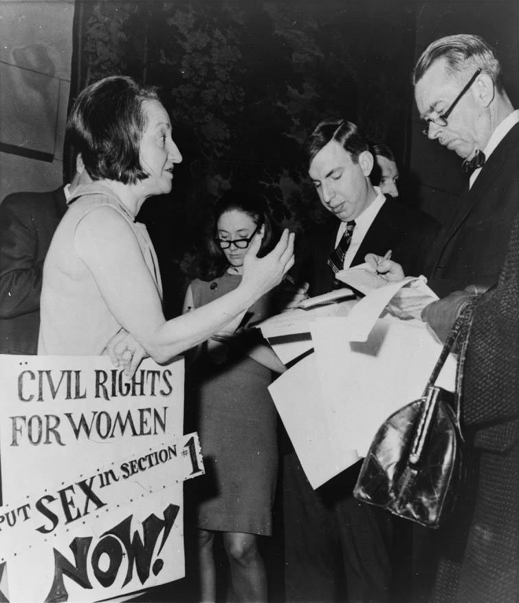 Бетти Фридан, президент Национальной организации женщин, беседует с журналистами. 4 апреля 1967