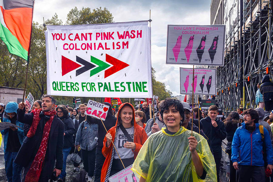 Участники уличной демонстрации с плакатом «Вы не можете оправдать колониализм. Квир за Палестину». Лондон. 21 октября 2023
