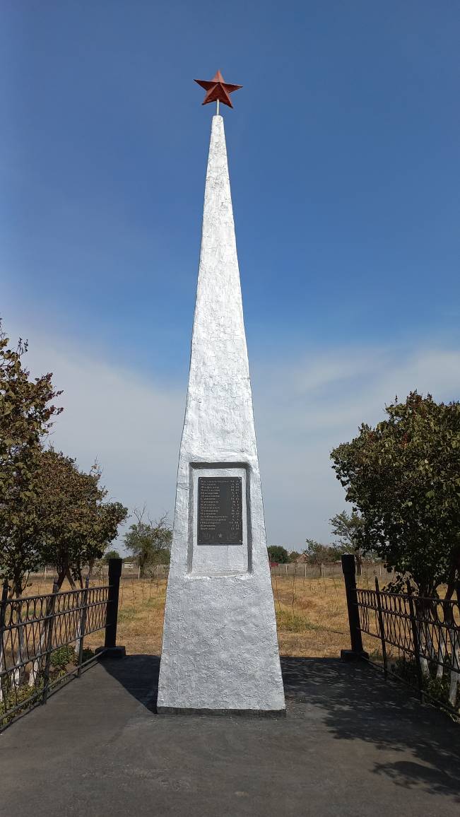 Он представляет собой шестиступенчатую пирамиду из побеленного кирпича с красной звездой на венце . Этот несколько примитивный памятный знак, немного напоминающий буддистскую ступу, был весьма типичен для послевоенного времени. Он также был включен в «Список памятников истории и культуры Ставропольского края», утвержденный решением Ставропольского краевого совета народных депутатов 1 октября 1981 года .