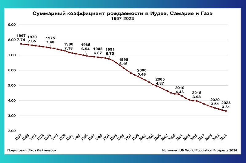 Как представлено с помощью Рисунка 1, с 1988 и по 2023 год суммарный коэффициент рождаемости в Иудее, Самарии и Секторе Газа снизился на 48.2% – с 6,87 до 3,31 ребёнка на женщину.