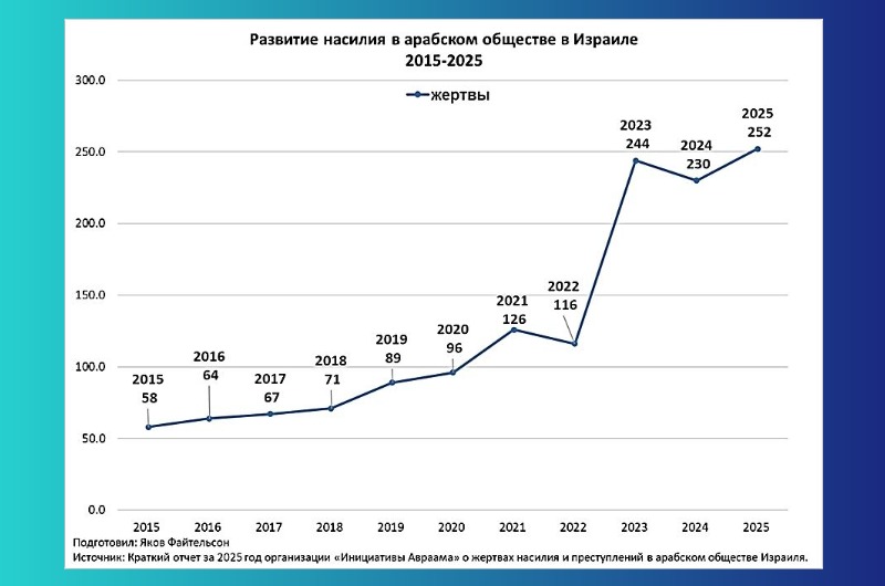 Ежегодные отчёты организации Abraham Initiatives показывают, что число жертв убийств в арабских общинах выросло с 58 в 2015 году до 252 в 2025 году, с резким ускорением после 2021 года. Только в 2023 году были убиты 244 араба и 47 евреев, что соответствует примерно уровню 11,8 и 0,66 убитых на 100 000 жителей, соответственно.