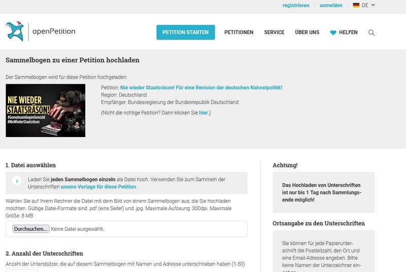 В то же время openPetition допустила серьезную ошибку в своих предупреждениях, поскольку указания были размещены на интернет-сайте петиции, но не на бланках для сбора подписей. На этих бланках по-прежнему указаны только имя Хоффмана и логотип openPetition, благодаря чему они выглядят не вызывающими подозрений. Это, вероятно, объясняет, почему сторонники халифата так активно распространяли антиизраильскую петицию в предрождественский период: прохожие, к которым они обращались, видели только бланки для сбора подписей и ничего не знали об идеологической подоплеке кампании.
