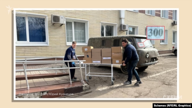 Также на фотографии хирурга Кузнецова из этой поездки в тот же день, 24 февраля, виден военный эвакуационный автомобиль УАЗ с отметкой "300" – в таких автомобилях российские военные обычно перевозят раненых.