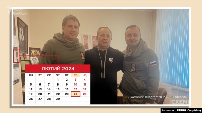 Данные пересечения границы хирургом Андреем Крячко, которые "Схемы" получили с помощью источников с доступом к такой информации, также подтверждают, что 24 февраля 2024 года краснодарский врач въехал на оккупированную территорию Украины. Кроме того, на одной из фотографий, сделанной в кабинете на тот момент заместителя директора больницы ДОКТМО Ивана Плахотникова, виден календарь с отметкой. Похоже, это суббота и, вероятно, 24 февраля 2024 года: