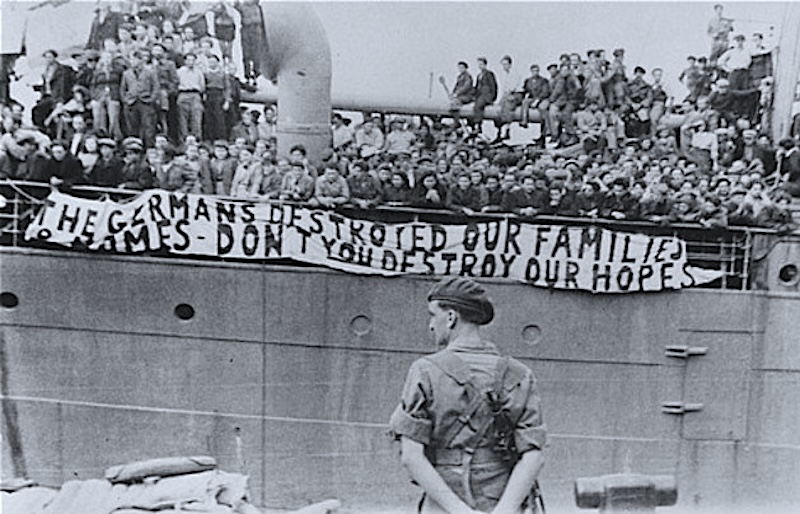 В 1947 году «Эксодус» с 4 500 пассажирами на борту остановлен британским флотом. Произошло жёсткое столкновение, были убитые и раненые. Беженцев вернули в Европу (в Германию!), в лагеря для перемещенных лиц.