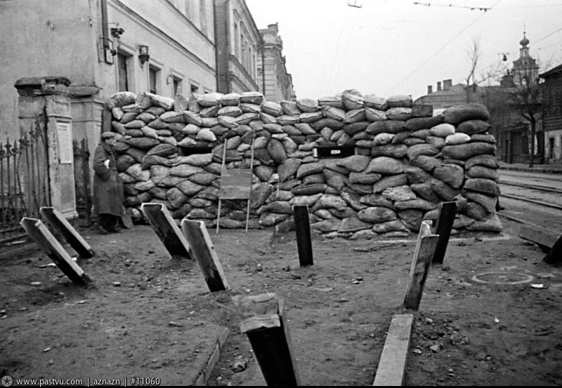 Тверская в районе Маяковской. Из воспоминаний: «Без винтовок уходили на фронт в это время ополченцы. Те, кто с винтовками молодые, кроме одного, с лысиной. Мой родственник (со стороны жены) ушёл с ополчением как раз в это время. Без винтовки. В атаку на танки шёл с палкой (винтовка была 1 на троих, приказ - взять оружие в бою). Естественно, был взят в плен, откуда вернулся в 44-45-м. Работал на ферме у немца в Прибалтике,видимо не сочли военнопленным.»