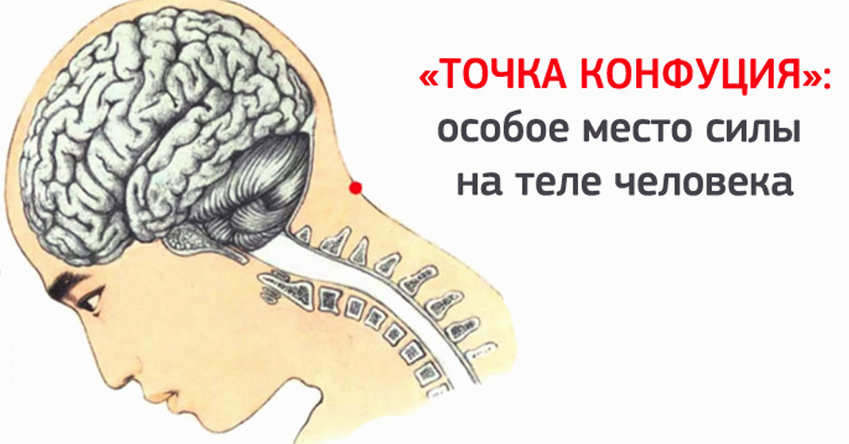 «Точка Конфуция» расположена под затылочной костью примерно на 2,5 см выше задней границы роста волос в ямке внешнего края трапециевидной мышцы, где ощущается углубление.