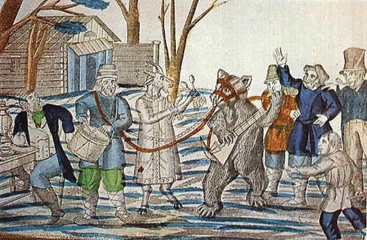 В старину у бродячих трупп главным актером был ученый, дрессированный медведь , за ним шествовала "коза", ряженый с козьей шкурой на голове, и только за "козой" – барабанщик.