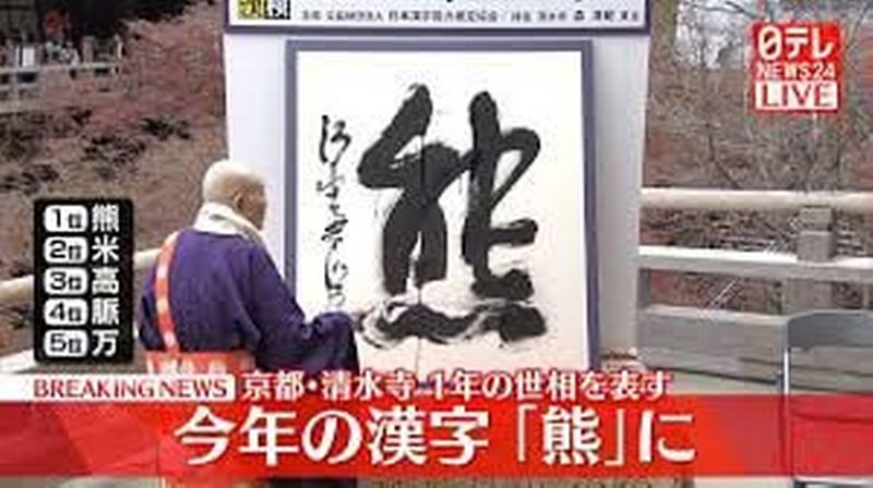 Как и в прошлые годы иероглиф года начертал черной тушью на листе рисовой бумаги размером 130 на 150 сантиметров настоятель святилища монах Сэйхан Мори. Он настолько замысловато начал выводить его огромной кистью, что комментаторы телеканалов поначалу даже не поняли, что имеется в виду.