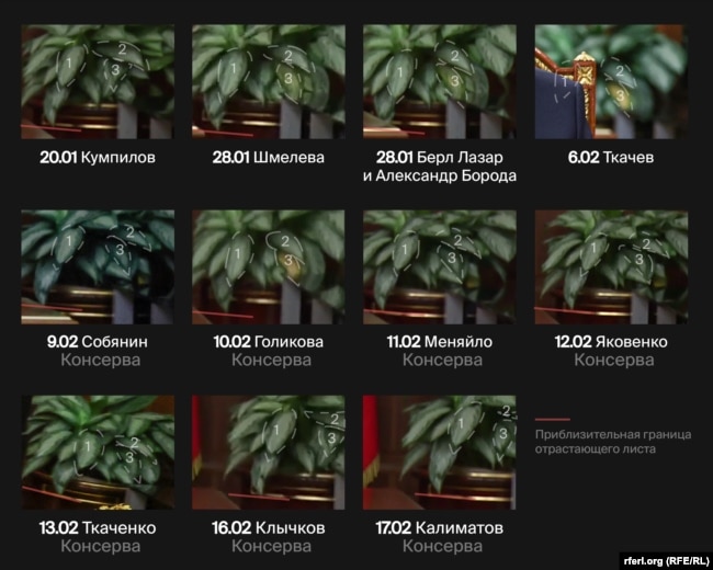Жухлый лист можно заметить на видео со встречи с главным раввином России Берлом Лазаром и главой Федерации еврейских общин Александром Бородой (28 января). На встрече с руководителем компании "Мантера" Александром Ткачевым (6 февраля) видно, что этот лист совсем пожелтел. А другие листья – отросли. По состоянию растения можно судить об очередности встреч.