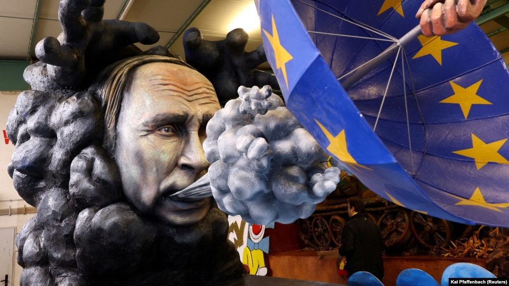 Фигура, изображающая президента России Владимира Путина, отравляющего Евросоюз своим дыханием, изготовленная для ежегодного карнавала в немецком городе Майнце. 14 февраля 2023 года