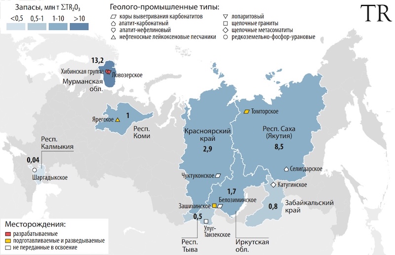 Ну и чтобы не быть голословным, обратимся к российскому сайту nedradv.ru , имеющему доклад «Редкоземельные металлы России. 2022 год». Из официального источника: Государственный доклад «О состоянии и использовании минерально‑сырьевых ресурсов Российской Федерации в 2022 году». Государственным балансом запасов полезных ископаемых РФ учтено 18 коренных месторождений с запасами РЗМ, а также 2 техногенных.