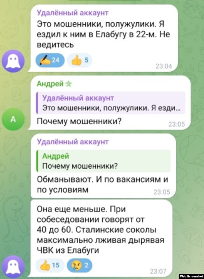О подобном опыте рассказывают и на других сайтах. Среди комментариев под рекламными объявлениями "Соколов" можно встретить рассказы о людях, которым после приезда на место дислокации "Соколов" предлагали подписать контракт штурмовика с другим подразделением. Ни одного рассказа о личном опыте службы в "Сталинских соколах" Радио Свобода найти не удалось.