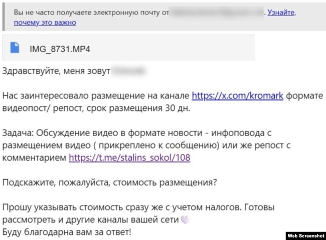 В январе один из авторов этого материала получил предложение от сотрудницы еще одного российского маркетингового агентства, Rasklad, разместить в своем личном англоязычном аккаунте в социальной сети X рекламное видео "Сталинских соколов" – нам объяснили, что "заказчик хочет выйти на англоязычную аудиторию", а алгоритмы подсказали подходящие аккаунты, в числе которых оказался аккаунт журналиста Радио Свобода. К этому моменту мы уже несколько раз обращали внимание на "соколов", но еще не пытались контактировать ни с кем из связанных с ними людей.